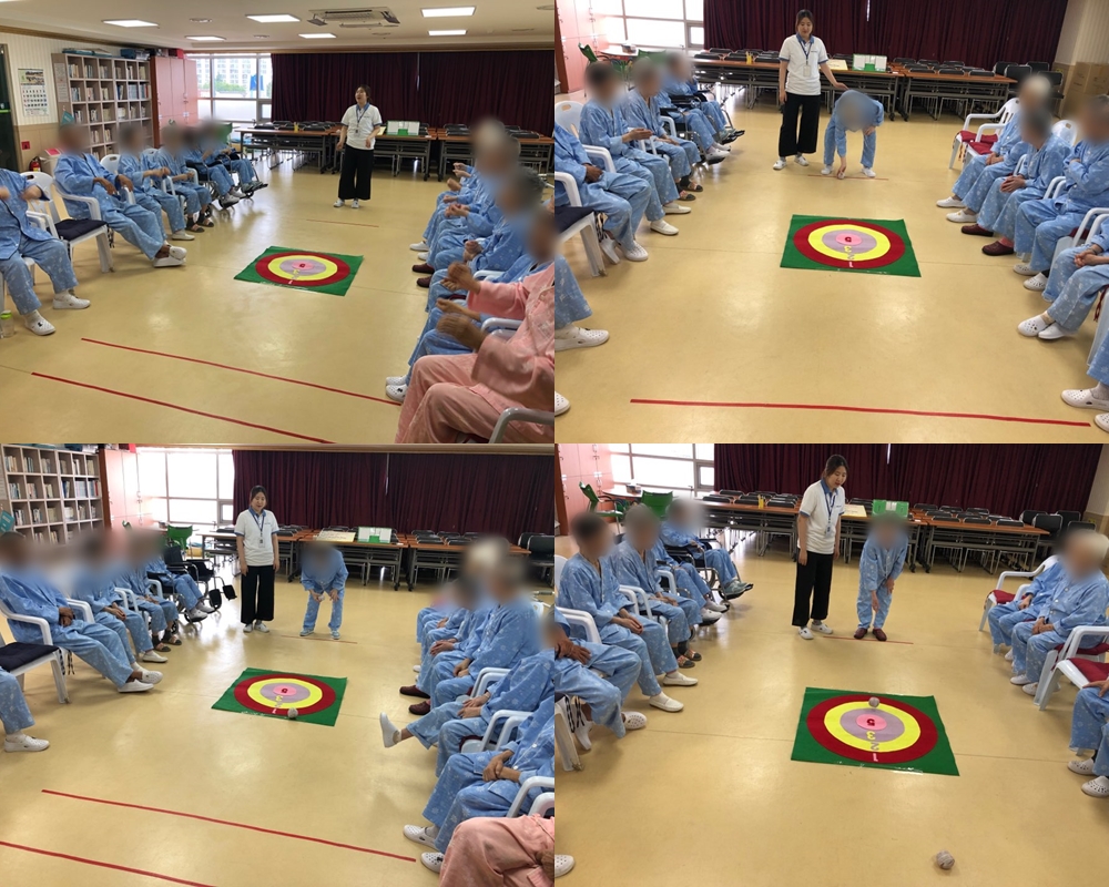치료레크리에이션 - 과녁 맞추기 본문 2019년 06월 10일 (월) 오늘은 치료레크리에이션으로 과녁 맞추기를 하였습니다. 천천히 공을 굴리기도 하고 세게 굴려보기도 하며 다양하게 공을 굴리며 재미있는 경기를 보여주었습니다!! 어르신들 모두 각자의 잘하는 방법을 서로에게 알려주며 즐겁게 하셨습니다~ 이전글 목록 다음글