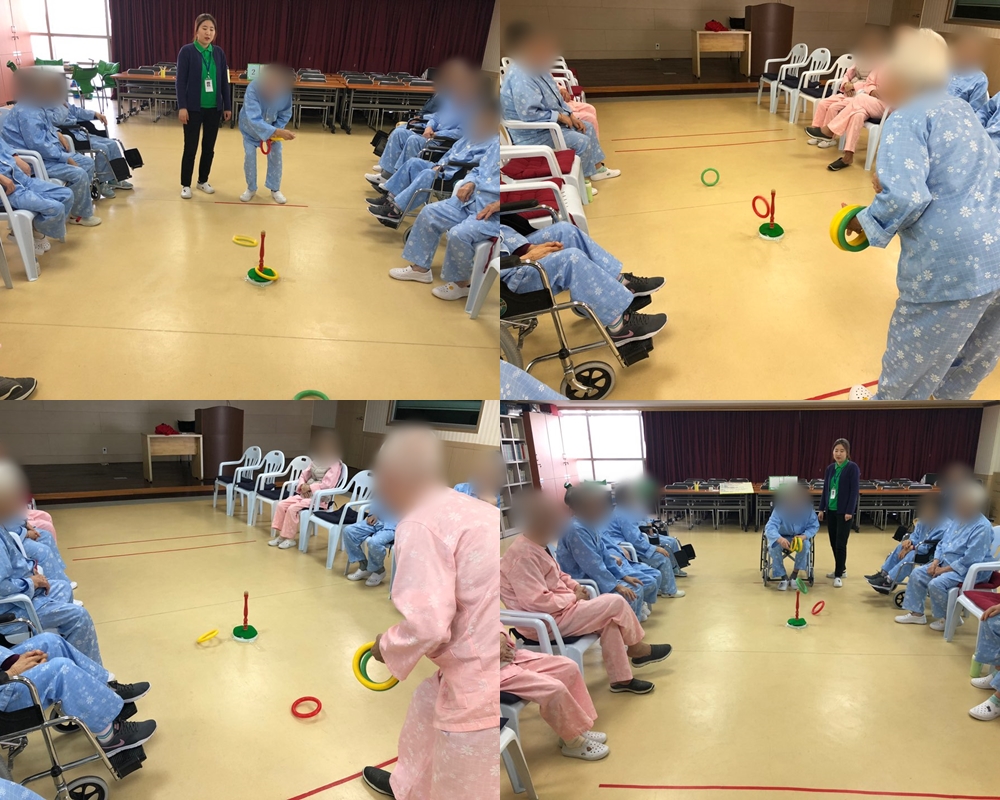 치료레크리에이션 - 고리 던지기 본문 2019년 03월 21일 (목) 오늘은 치료레크리에이션으로 고리 던지기를 하였습니다. 오늘은 청팀과 홍팀 막상막하의 경기를 보여주셨고 어르신들 모두 마지막 경기 때까지 긴장을 놓지 않고 집중하여 열심히 하셨습니다! 마지막 경기에서 승패가 결정되고 패배한 팀은 크게 아쉬워하며 다음 경기 때를 기대하셨습니다~~ 이전글 목록 다음글