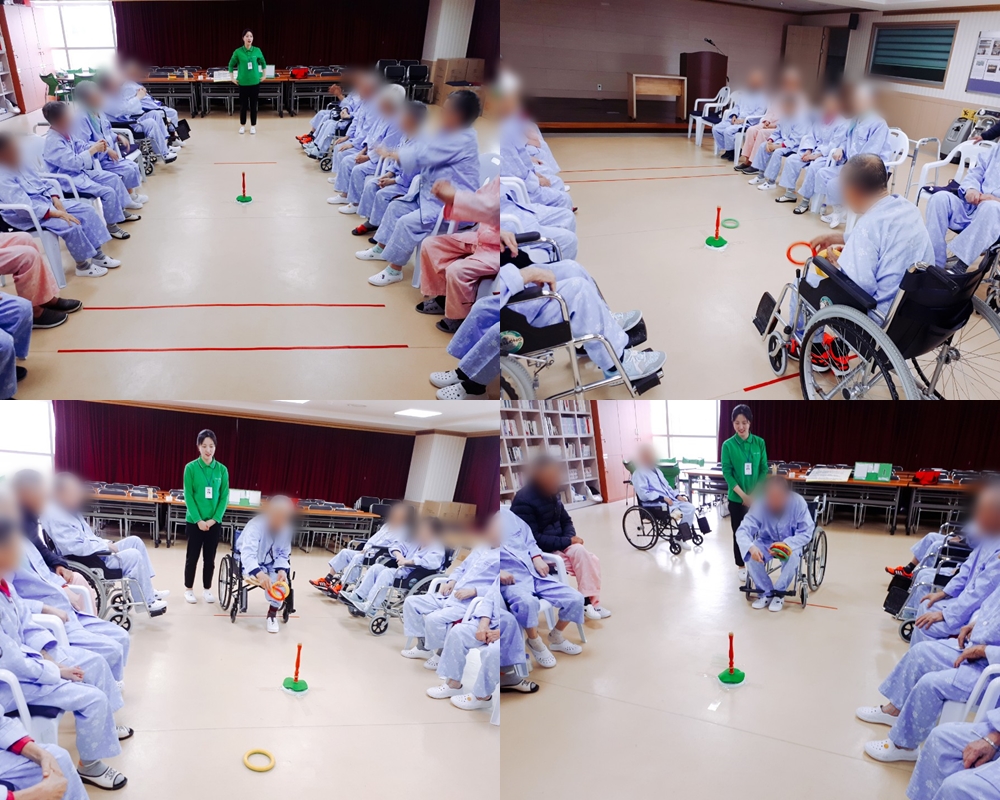 2019년 04월 09일 (화) 오늘은 치료레크리에이션으로 고리 던지기를 하였습니다.