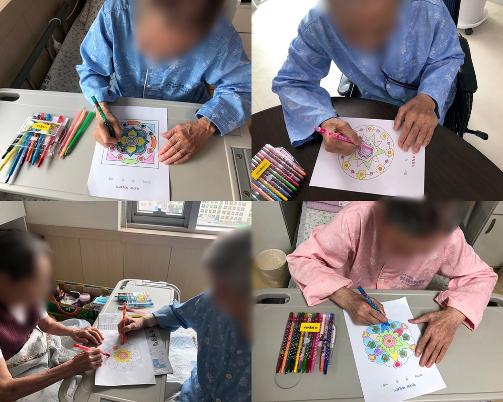 미술치료 - 만다라 색칠하기 본문 2019년 06월 18일 (화) 오늘은 미술치료로 만다라 색칠하기를 하였습니다. 그림이 예쁘다며 좋아하셨고 알록달록 완성된 그림을 보고 활짝 웃으셨습니다 !! 그림이 단순한 듯 어렵다며 말씀하셨지만 열심히 하셨고 재미있어 하셨습니다~ 이전글 목록 다음글