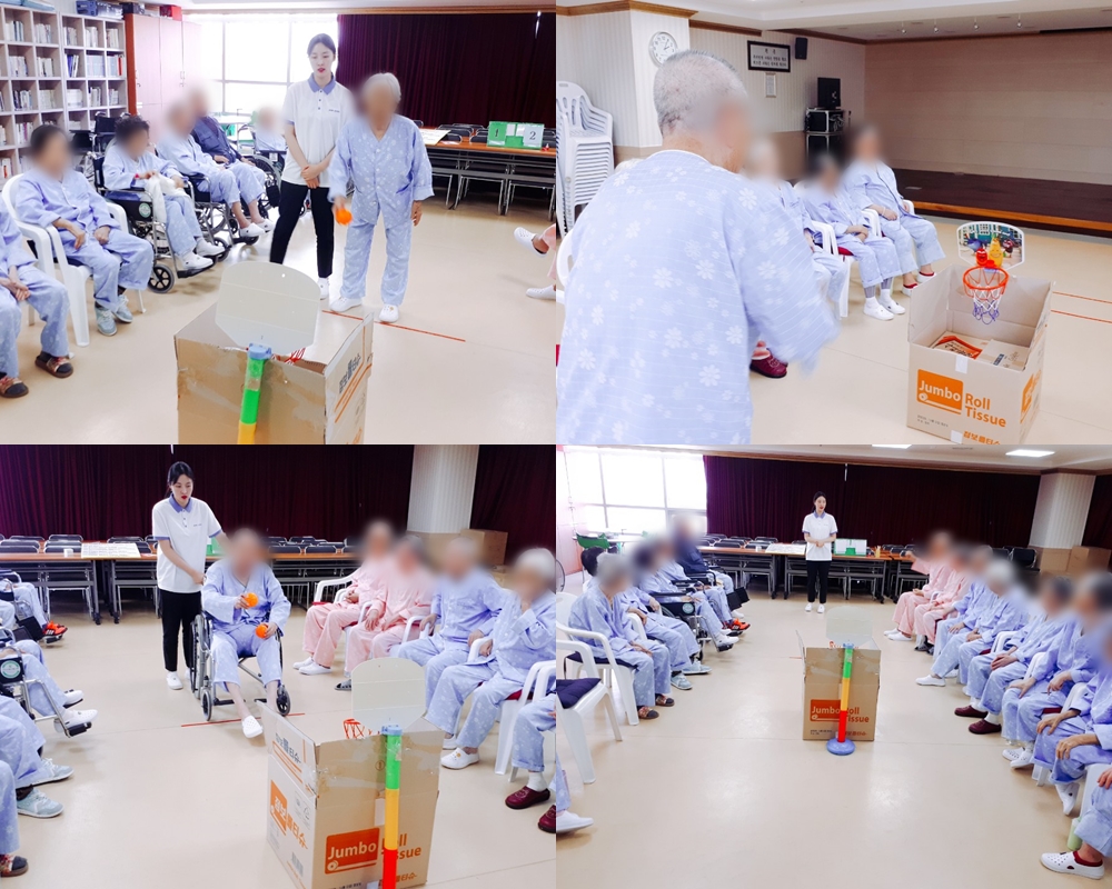 치료레크리에이션 - 농구 본문 2019년 07월 04일 (목) 오늘은 치료레크리에이션으로 농구를 하였습니다. 어르신들께서는 오늘 최상의 컨디션을 보이시며 높은 점수를 많이 획득하셨고, 골인을 할 때마다 매우 기뻐하셨습니다~ 이전글 목록 다음글