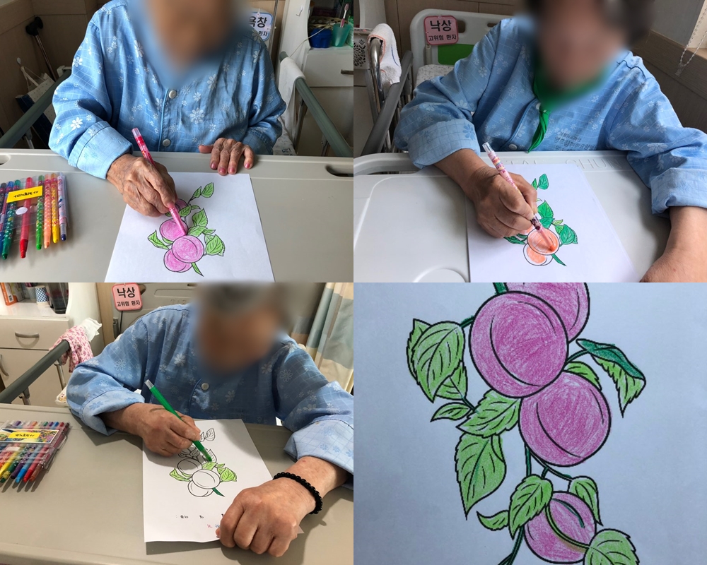 미술치료 - 색칠하기 본문 2019년 07월 08일 오전 프로그램으로 미술치료로 색칠하기를 하였습니다. 그림을 보고 어떤 열매인지 추측하며 임의로 어르신들께서 열매를 정하여 색칠하셨습니다 ^^ 꼼꼼하게 칠하기 위해 집중하여 열심히 하셨습니다 ~ 이전글 목록 다음글