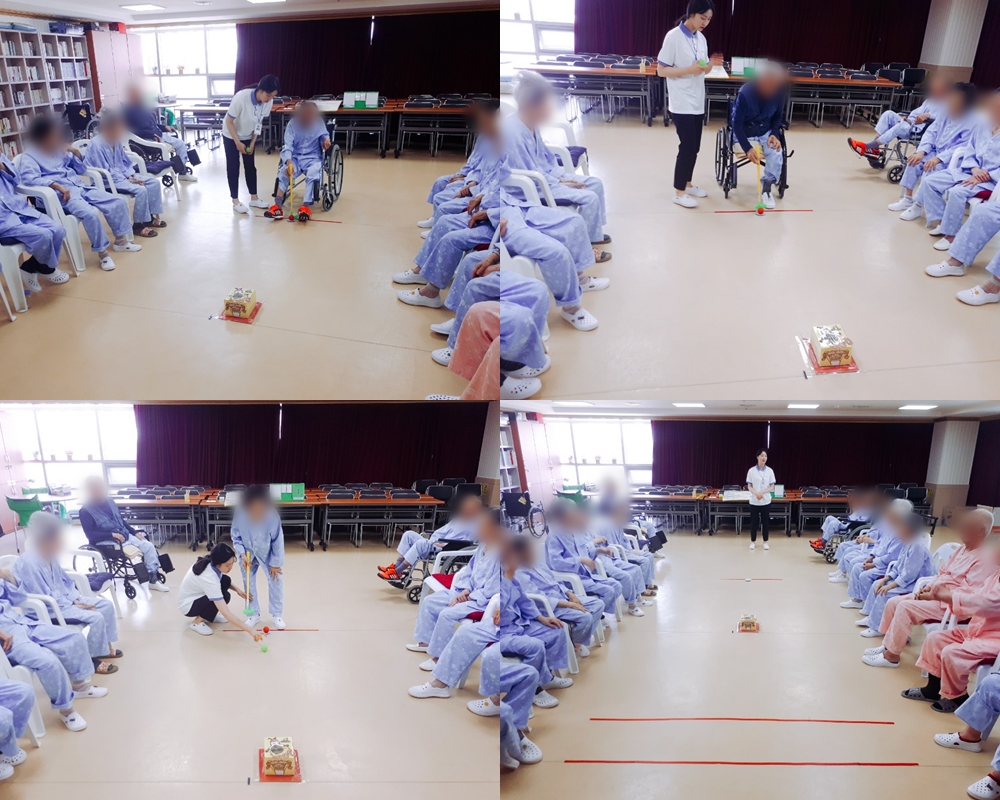 치료레크리에이션 - 골프 본문 2019년 07월 16일 (화) 오늘은 치료레크리에이션으로 골프를 하였습니다. 오늘은 청팀이 승리를 하지 못하게 되어 개인전에서 점수를 좀 낮춰달라는 부탁을 하셨고, 개인전에서 많은 어르신께서 성공하지 못하게 되자 매우 아쉬워하셨습니다~ 이전글 목록 다음글