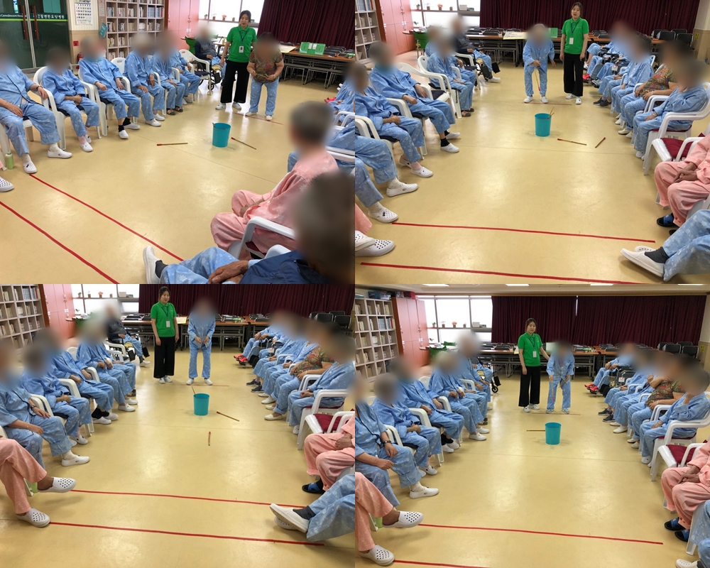 치료레크리에이션 - 투호 본문 2019년 07월 25일 (목) 오늘은 치료레크리에이션으로 투호를 하였습니다. 어르신들 모두 즐겁게 참여하셨으며 서로 웃으며 재미있어 하셨습니다. 칭찬도 서로서로 아낌 없이 하며 화기애애한 분위기였습니다~ 이전글 목록 다음글