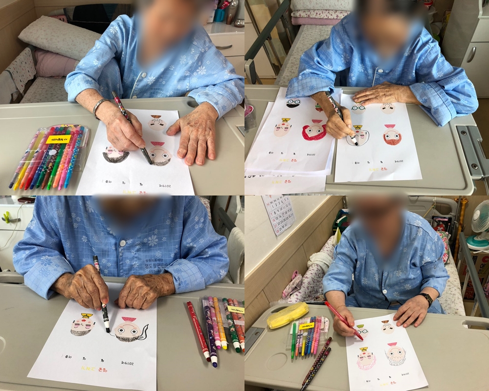 미술치료 - 얼굴 그리기 본문 2019년 07월 26일 (금) 오늘은 미술치료로 얼굴 그리기를 하였습니다. 처음 그려보는 그림이라 낯설어 하셨지만 어르신들께서 우스꽝스러운 그림에 그림을 그려 재미있다고 좋아하셨습니다 ^^ 그림 그리시는 내내 "우습다"를 말씀하시며 즐겁게 하셨습니다 ! 이전글 목록 다음글