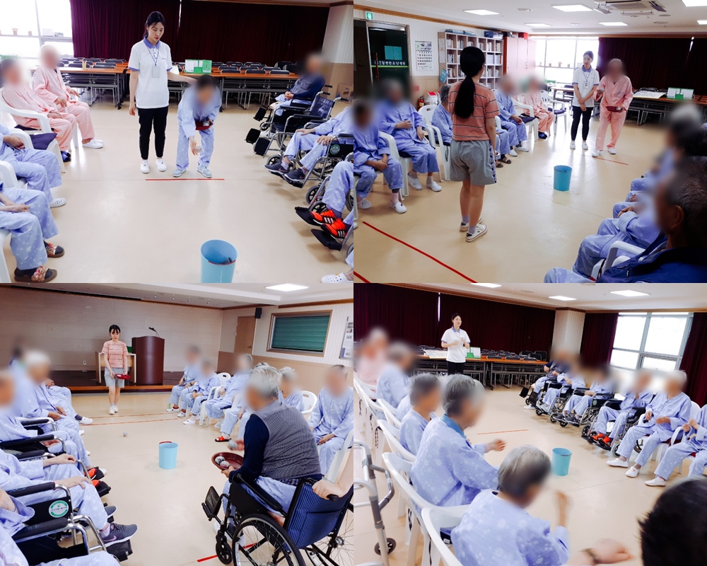 치료레크리에이션 - 신문지공 넣기 본문 2019년 07월 29일 (월) 오늘은 치료레크리에이션으로 신문지공 넣기를 하였습니다. 어르신들께서는 모두 신문지공을 힘껏 던지시며 즐겁게 게임에 잘 참여하셨고, 신문지공 5개가 모두 들어갔을 때는 활짝 웃으시며 매우 기뻐하셨습니다~~ 이전글 목록 다음글