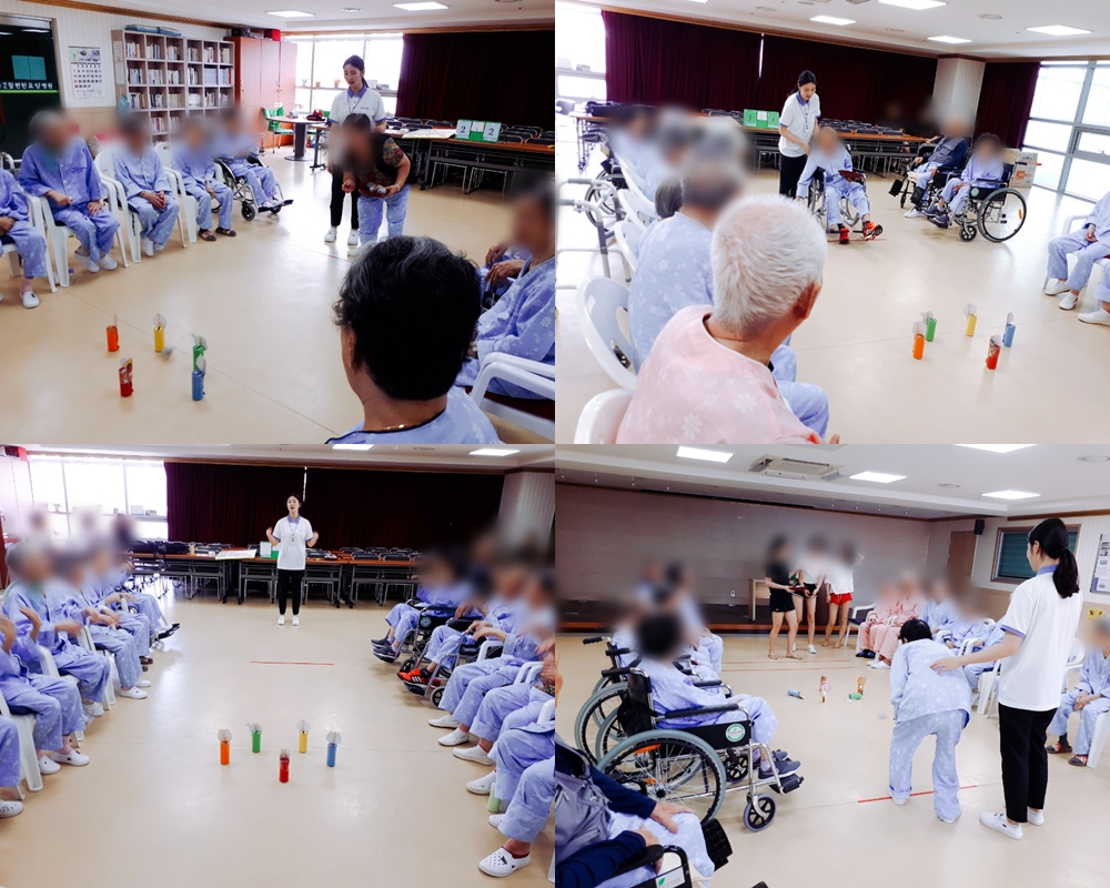 치료레크리에이션 - 동물 맞추기 본문 2019년 07월 31일 (수) 오늘은 치료레크리에이션으로 동물 맞추기를 하였습니다. 어르신들께서는 힘껏 신문지공을 던져 동물모형을 맞추며 즐거워하셨고, 모형을 모두 넘어뜨렸을 때는 크게 박수를 서로 쳐주셨습니다~ 이전글 목록 다음글