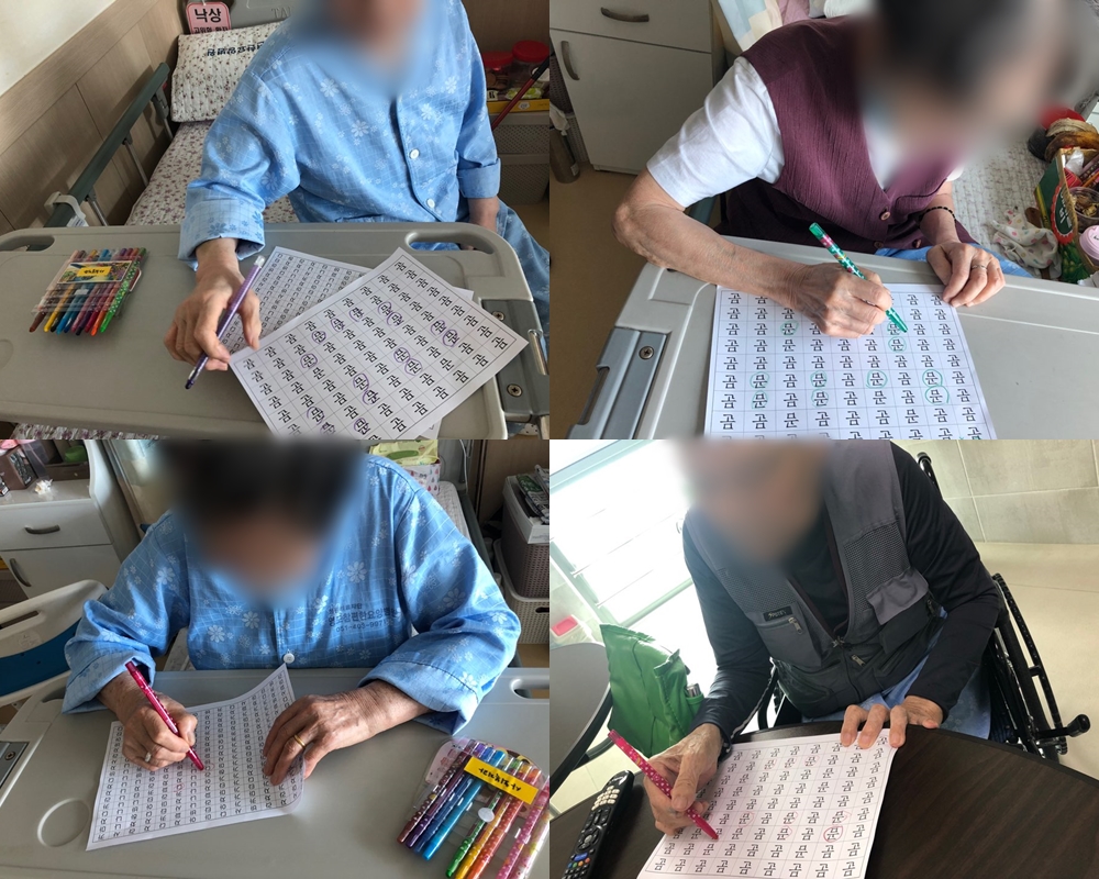 인지치료 - 단어 찾기 본문 2019년 08월 07일 인지치료로 단어 찾기를 하였습니다. 섞여있는 글자들 속 찾아야하는 글자를 잘 찾아내셨고 찾을수록 재미있다며 어르신들께서 즐거워하셨습니다! 이전글 목록 다음글