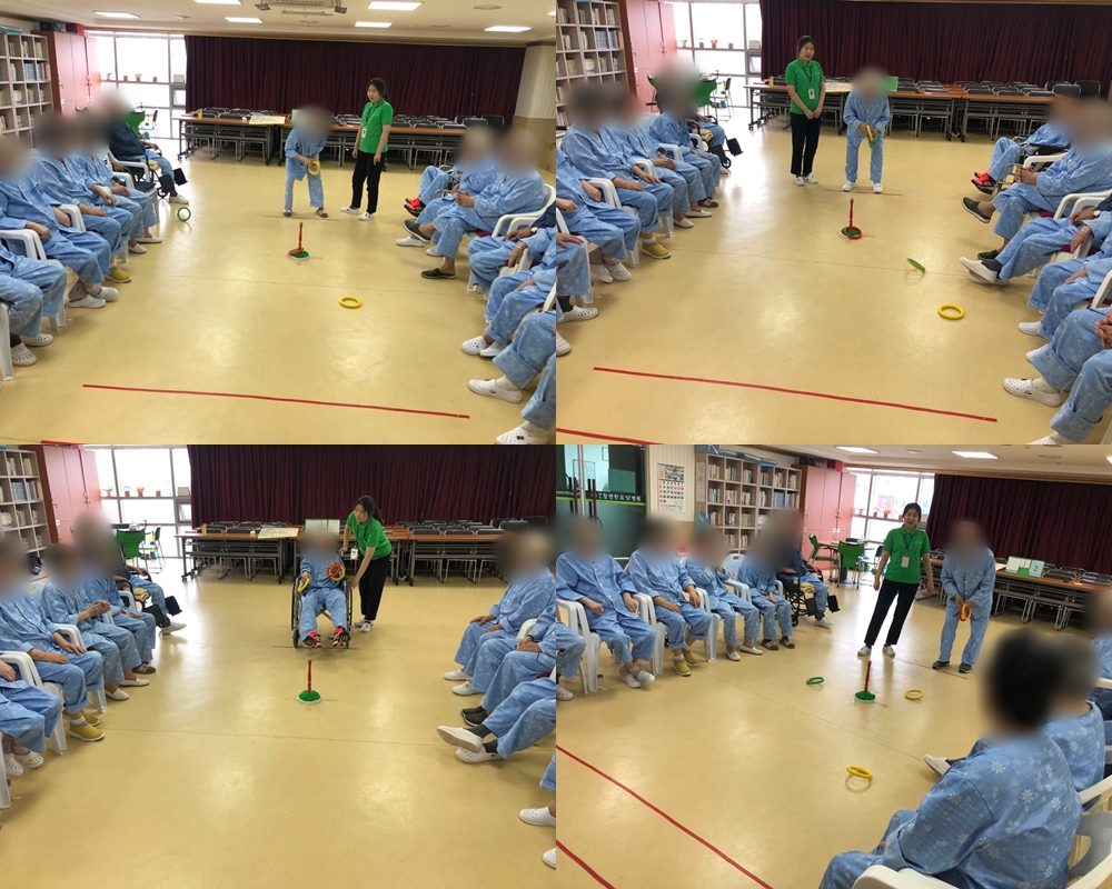 치료레크리에이션 - 고리 던지기 본문 2019년 09월 05일 (목) 오늘은 치료레크리에이션으로 고리 던지기를 하였습니다. 평소보다 고리가 잘 걸어지지 않자 어르신들께서 의아해 하며 "왜 이럴까"라고 말씀하셨습니다. 서로 응원하며 열심히 하셨지만 오늘은 저조한 점수를 보이셨고 아쉬운 경기였습니다~ 이전글 목록 다음글