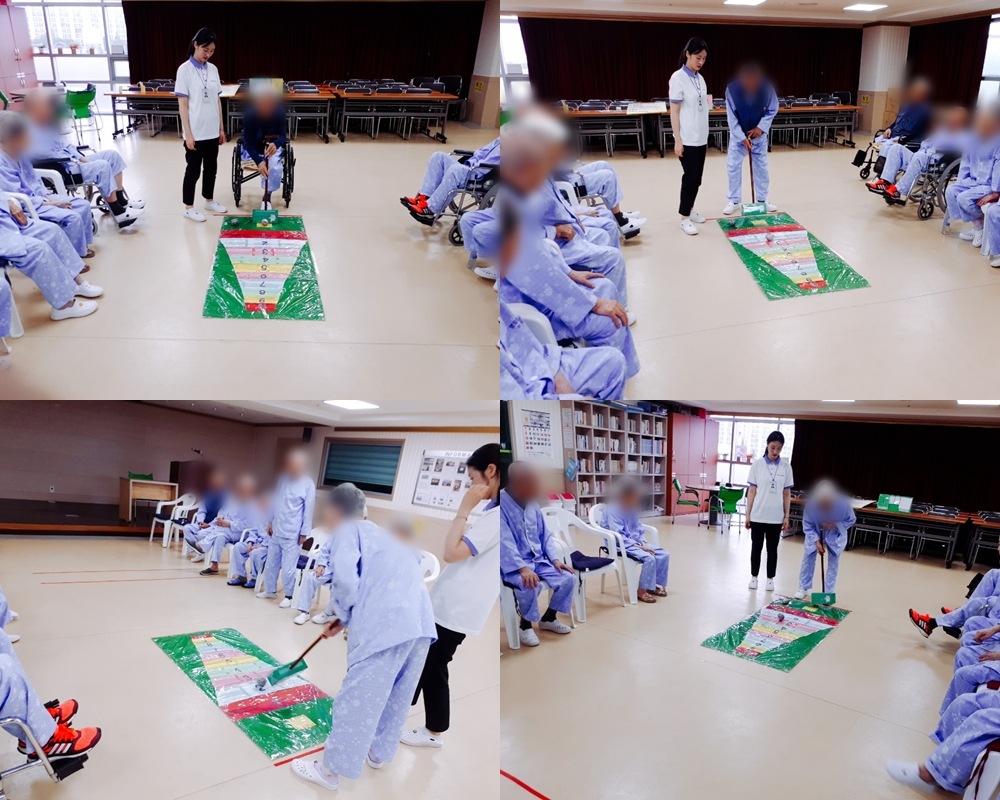 치료레크리에이션 - 게이트 볼 본문 2019년 09월 11일 (수) 오늘은 치료레크리에이션으로 게이트 볼을 하였습니다. 어르신들께서는 오늘따라 10점에 가까운 점수를 획득하시며 높은 성적을 보여주셨고, 서로 높은 점수를 받을 때마다 칭찬해주는 훈훈한 모습들을 많이 보여주셨습니다~^^ 이전글 목록 다음글