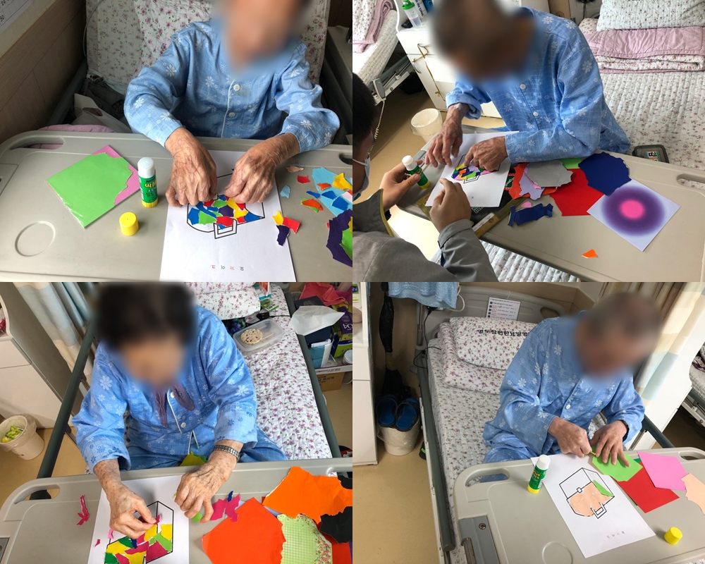 미술치료&작업치료 - 모자이크 본문 2019년 10월 07일 (월) 오늘은 미술치료&작업치료로 모자이크를 하였습니다. 어떤 색종이로 붙이면 더 예쁜 그림이 될까 오랫동안 고민하시며 신중하게 하셨습니다 ^^ 미소를 지으며 재미있어 하셨고 열심히 하셨습니다~ 이전글 목록 다음글