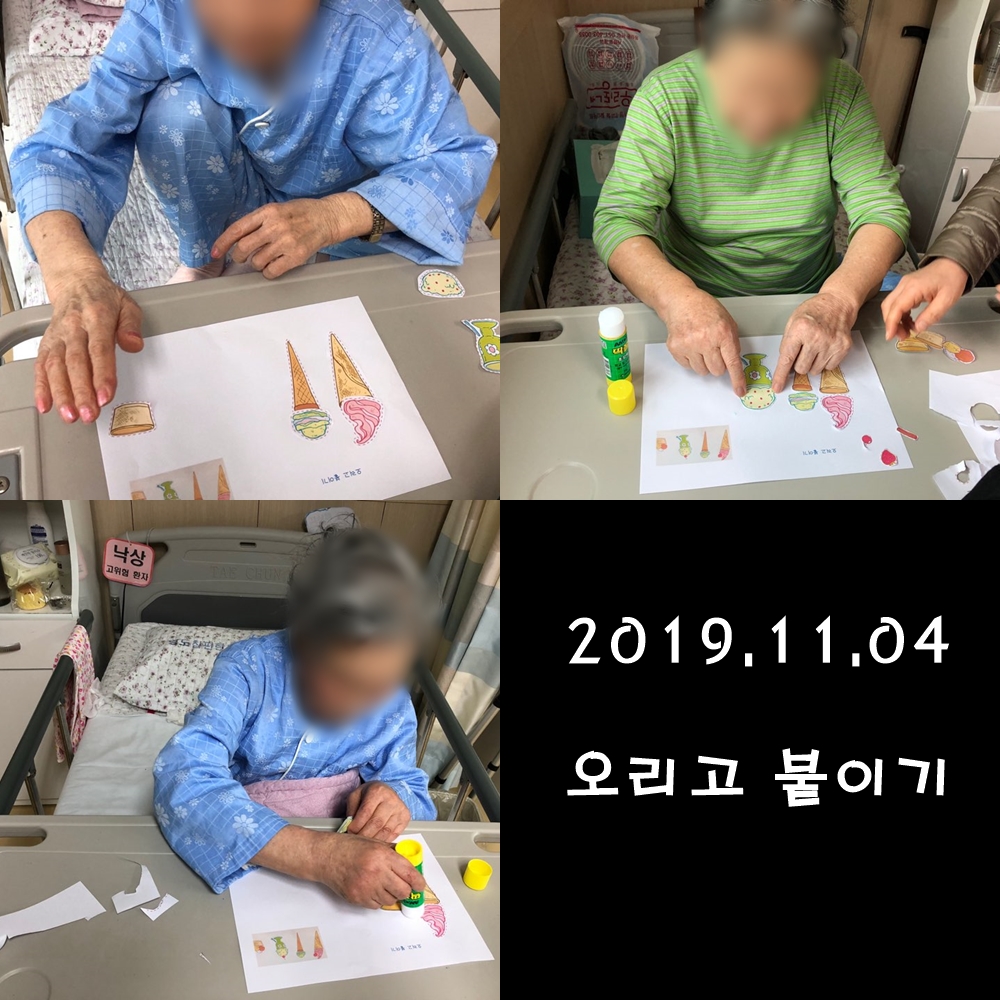 미술치료 - 오리고 붙이기 본문 2019년 11월 04일 (월) 오늘은 미술치료로 오리고 붙이기를 하였습니다. 완성 된 아이스크림 그림을 보고 맛있겠다며 활짝 웃으셨습니다 !! 그림이 알록달록하다고 예쁘다고 하셨습니다 ~ 이전글 목록 다음글