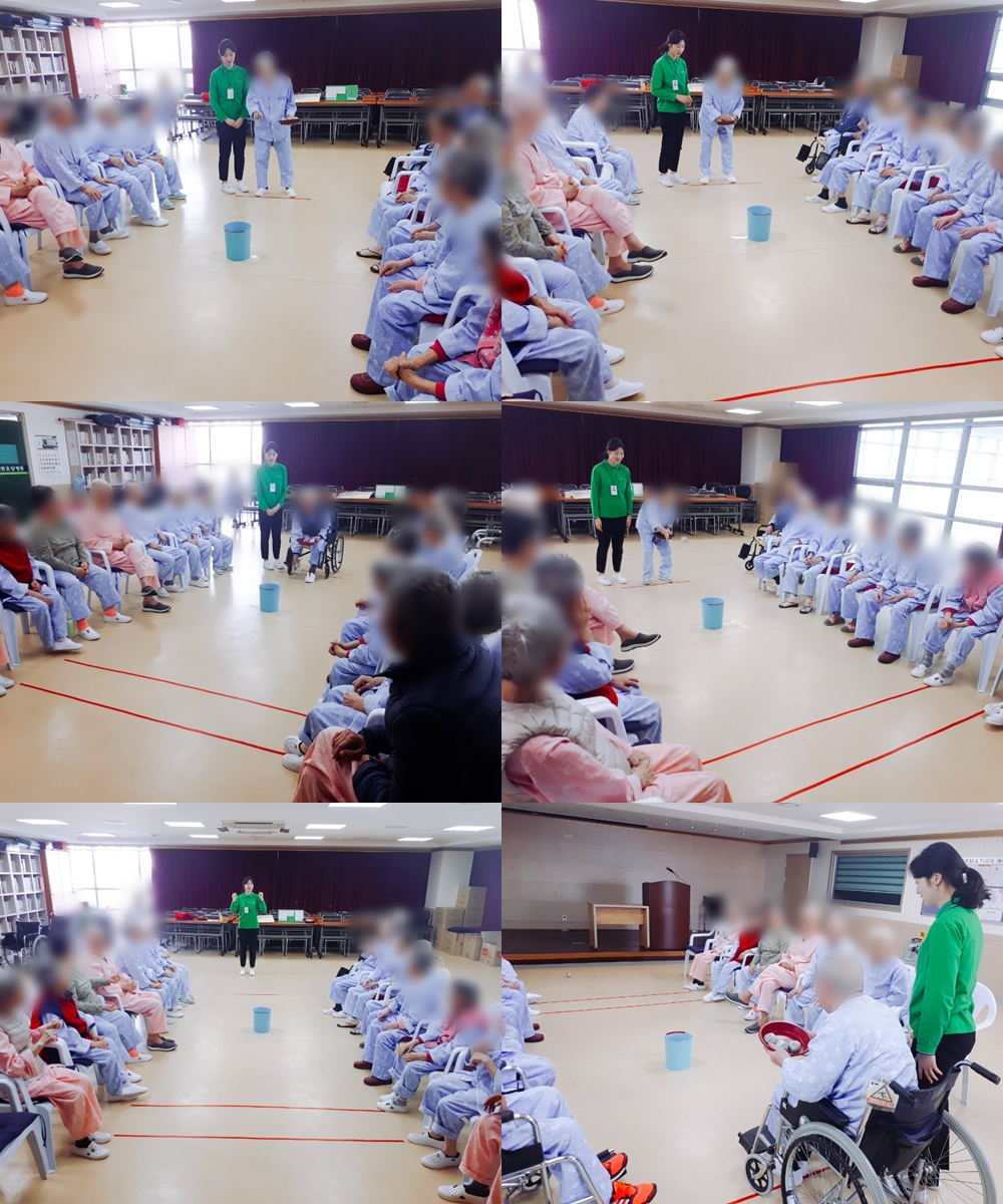 2019년 02월 25일 (월) 오늘은 치료레크리에이션으로 신문지공 넣기를 하였습니다.