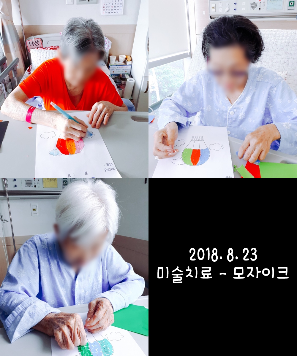 미술치료 - 모자이크 본문 2018년 8월 23일 (목) 오늘은 미술치료로 모자이크를 하였습니다. 종이를 직접 찢어 붙이니 예쁘게 잘 붙여지지 않는다며 불만족스러워하기도 하셨지만 나중에 완성된 그림을 보고는 마음에 들어하셨습니다~ 이전글 목록 다음글