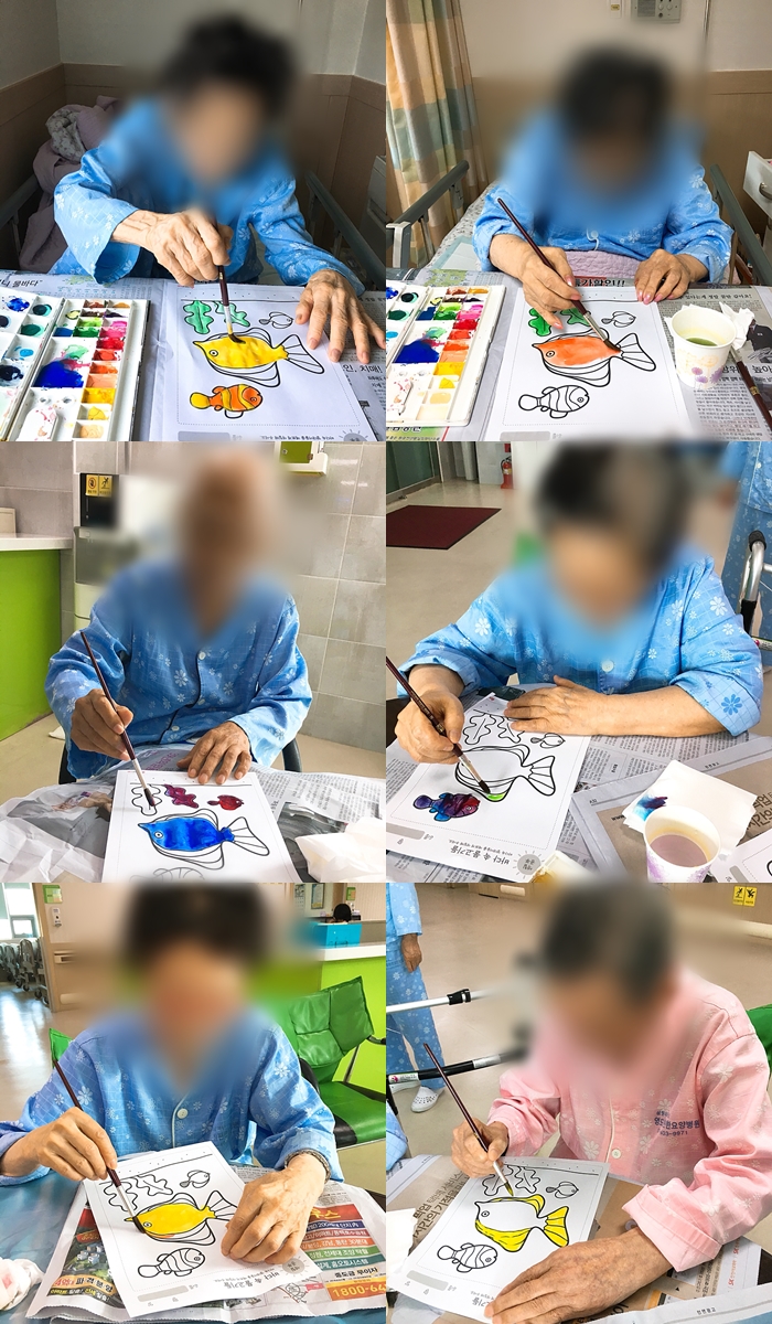 미술치료 - 수채화 본문 2018년 8월 7일 (화) 오늘은 미술치료로 수채화를 하였습니다. 물고기를 잡아서 매운탕을 해먹어야 겠다고 재밌는 농담을 하시면서 밝은 분위기 속에서 물감색칠을 하셨습니다~~^^ 이전글 목록 다음글