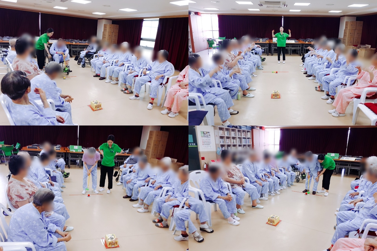 치료레크리에이션 - 골프 본문 2018년 8월 7일 (화) 오늘은 치료레크리에이션으로 골프를 하였습니다. 오늘은 어르신들께서 개인전에서 성공을 많이 하지 못해 2번씩 기회를 드리자 다행이라고 하시며 즐겁게 게임에 잘 참여하셨습니다~^^ 이전글 목록 다음글