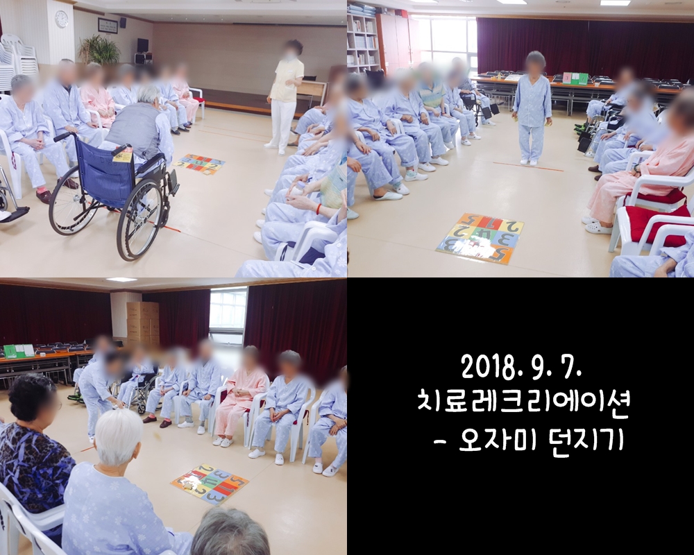 치료레크리에이션 - 오자미 던지기 본문 2018년 9월 7일 (금) 오늘은 치료레크리에이션으로 오자미 던지기를 하였습니다. 많은 어르신들께서 오자미 던지기에서 높은 점수를 획득하셔서 모두들 즐겁게 게임을 즐기셨습니다~~ 이전글 목록 다음글