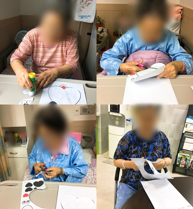미술치료 - 오리고 붙이기 본문 2018년 7월 5일 (목) 오전에는 병동 어르신들과 함께 미술치료로 오리고 붙이기를 하였습니다. 각자 자신의 얼굴과 비슷한 느낌으로 팬더의 얼굴을 오리고 붙이셨습니다~~^^ 이전글 목록 다음글