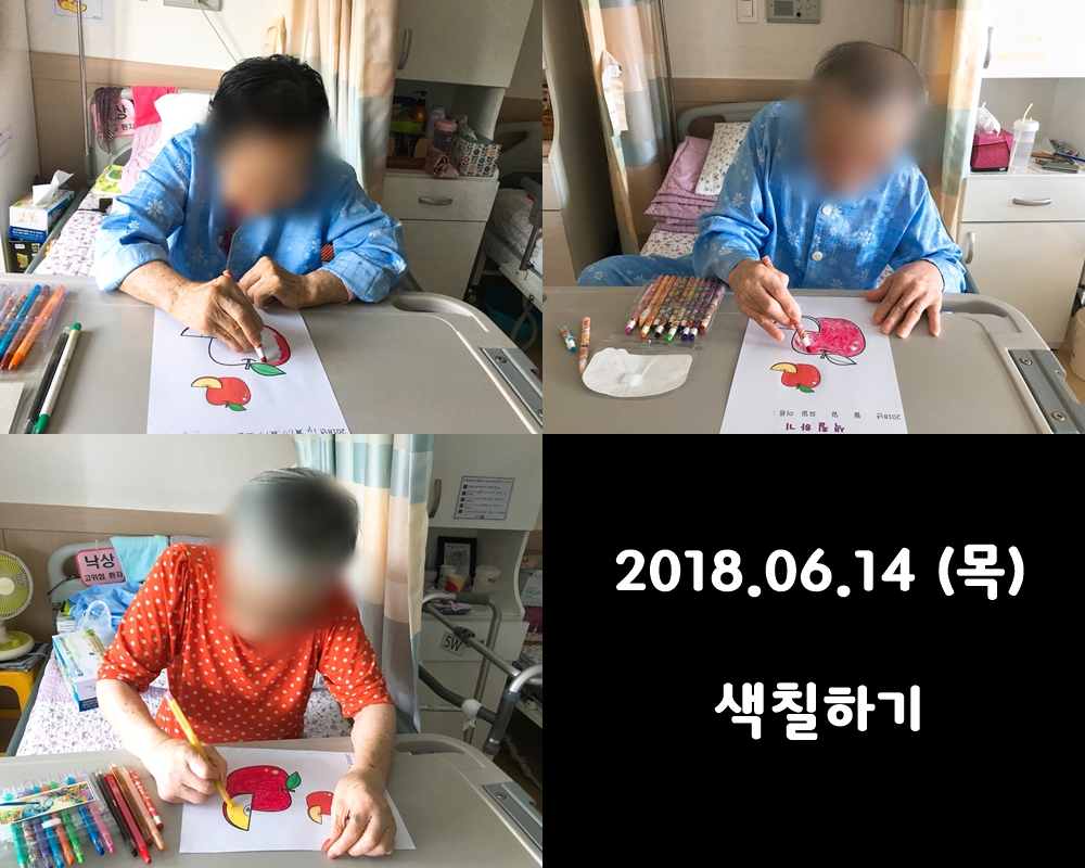 미술치료 - 색칠하기 본문 2018년 6월 14일 (목) 오전에는 병동 어르신들과 함께 미술치료로 색칠하기를 하였습니다. 어르신들께서는 진행자와 담소를 나누며 즐거운 마음으로 색칠하기를 하였습니다~~^^ 이전글 목록 다음글