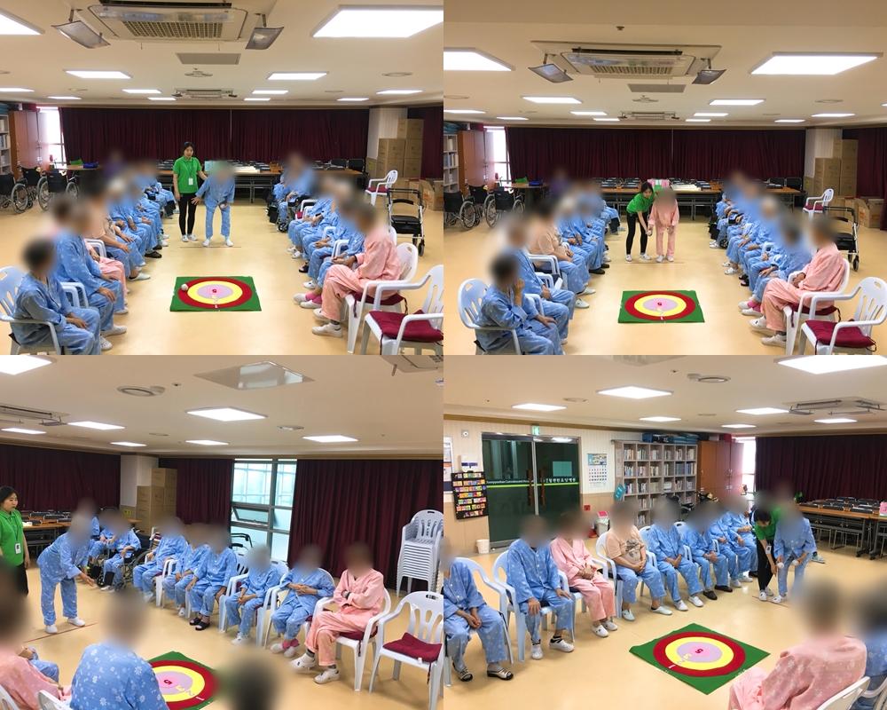 치료레크리에이션 - 과녁 맞추기 본문 2018년 6월 29일 (금) 오늘은 치료레크리에이션으로 과녁 맞추기를 하였습니다. 공이 자꾸 과녁판 밖으로 나가서 어르신들이 안타까워 하셨지만, 점수에 연연해 하지 않고 재밌게 게임을 끝마쳤습니다~~^^ 이전글 목록 다음글