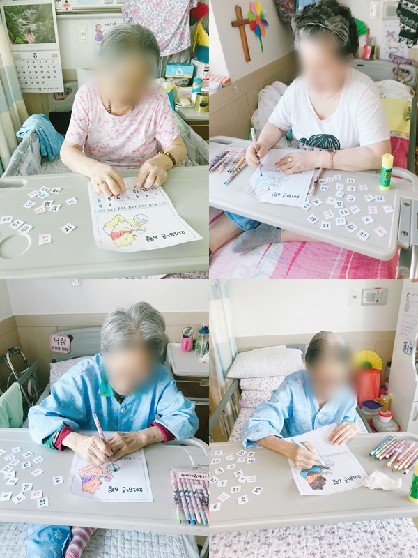 인지치료 - 6월 달력 만들기 본문 2018년 5월 30일 (수) 인지치료로 6월 달력 만들기를 하였습니다. 날짜를 순서대로 붙여가며 세월이 빠르다는 것을 느꼈는지 약간의 아쉬움을 표현하면서도, 달력 도안을 보고 마음에 들었는지 예쁘게 색칠도 잘 하셨습니다^^ 이전글 목록 다음글