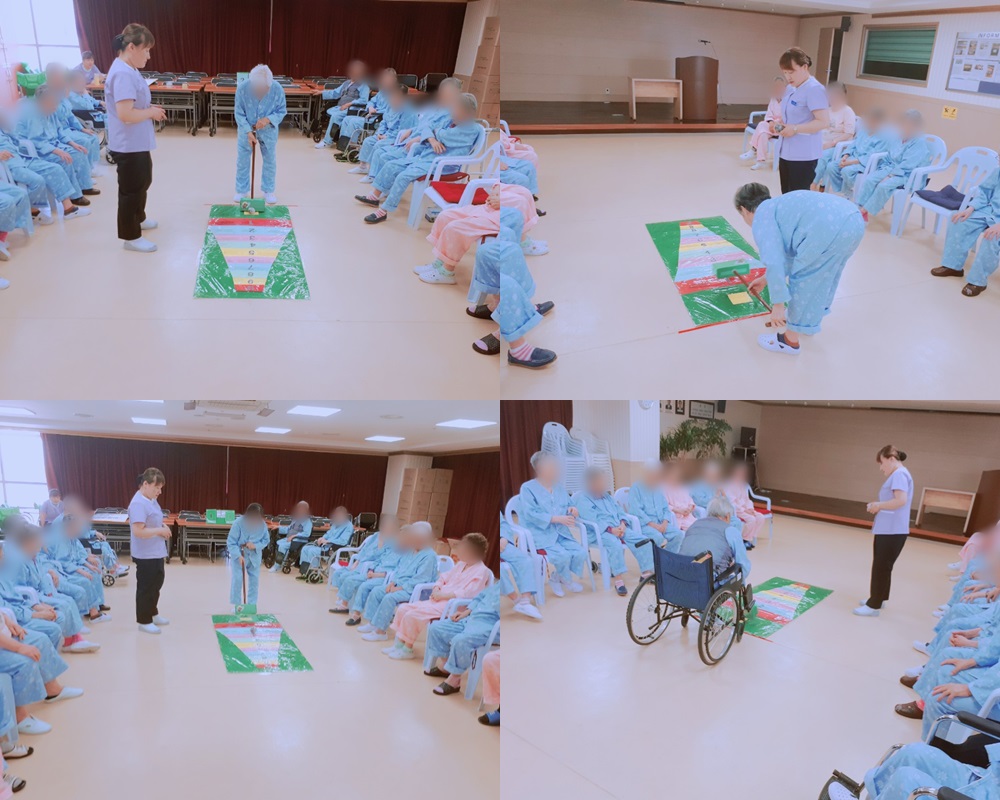 치료레크리에이션 - 게이트볼 본문 2018년 6월 4일 (월) 오늘은 치료레크리에이션으로 게이트볼을 하였습니다. 너무 세게 던지면 공이 밖으로 나가고 약하게 던지면 점수가 잘 안 나온다며 어찌해야할지 모르겠다는 말씀을 하셨지만 어르신들께서 모두 즐겁게 게임에 잘 참여하셨습니다~^^ 이전글 목록 다음글