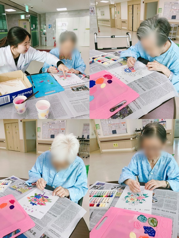 미술치료 - 물감 찍기 본문 2018년 5월 21일 (월) 오늘은 미술치료로 물감 찍기를 하였습니다. 파릇 파릇 예쁜 꽃들이 피어나는 봄을 맞이하여 알록 달록한 물감들로 꽃 도안에 물감 찍기를 하였습니다. 각자의 개성을 살려 꽃을 꾸미며 예쁘게 완성된 작품을 마음에 들어하셨습니다^^ 이전글 목록 다음글