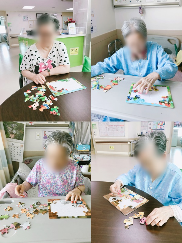 인지치료 - 퍼즐 본문 2018년 5월 14일 (월) 오늘은 인지치료로 퍼즐 맞추기를 하였습니다. 쉬운 난이도부터 시작하여 점점 어려워지는 퍼즐을 맞춰가며 당황하는 모습도 역력하였지만, 조금씩 맞춰지는 퍼즐이 신기하였는지 완성 후 박수를 치며 좋아하셨습니다^^ 이전글 목록 다음글