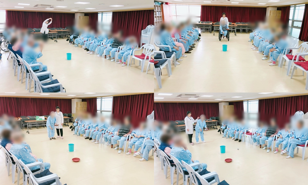 치료레크리에이션 - 신문지 공 넣기 본문 2018년 4월 5일 (목) 오늘은 치료레크리에이션으로 신문지 공 넣기를 하였습니다. 참여자들은 높은 점수를 받기 위해 공을 던질 때 신중한 모습을 보였지만, 마음처럼 공이 바구니 안으로 들어가지 않자 안타까운 마음을 표현하기도 했습니다~ 이전글 목록 다음글