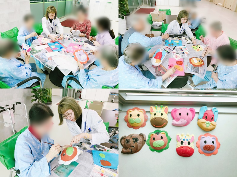 미술치료 - 탈 꾸미기 본문 2018년 4월 6일 (금) 오늘은 미술치료로 탈 꾸미기를 하였습니다. 토끼, 기린, 코끼리, 사자의 탈 중 자신의 원하는 모양을 선택하시고는, 물감을 섞어가며 예쁜 탈을 완성하셨습니다. 완성한 탈을 얼굴에 써보시고는 동물 모양을 흉내내며 즐거워하는 모습을 보이셨습니다^^ 이전글 목록 다음글