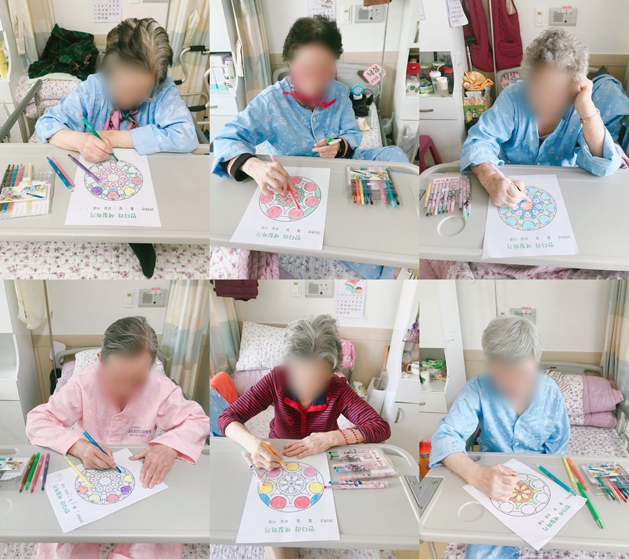 미술치료 - 만다라 색칠하기 본문 2018년 2월 19일 (월) 오늘은 미술치료로 만다라 색칠하기를 하였습니다. 복잡한 만다라 그림을 보시고는 어떻게 색칠할 지 걱정을 많이 하셨지만, 다양한 색깔을 사용하여 그림을 표현하셨고, 완성 후에는 자신의 그림을 보고 만족스러워 하셨습니다^^ 이전글 목록 다음글