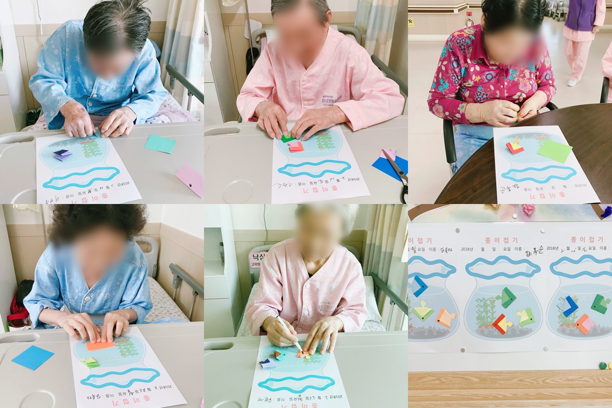 인지치료 - 종이접기 본문 2018년 2월 26일 (월) 오늘은 인지치료로 종이접기를 하였습니다. 예쁜 어항 그림 도안에 자신이 원하는 색깔의 색종이로 물고리를 접어 붙이자, 헤엄쳐 가는 모습이 상상이 된다며 즐겁게 종이접기를 끝냈습니다^^ 이전글 목록 다음글