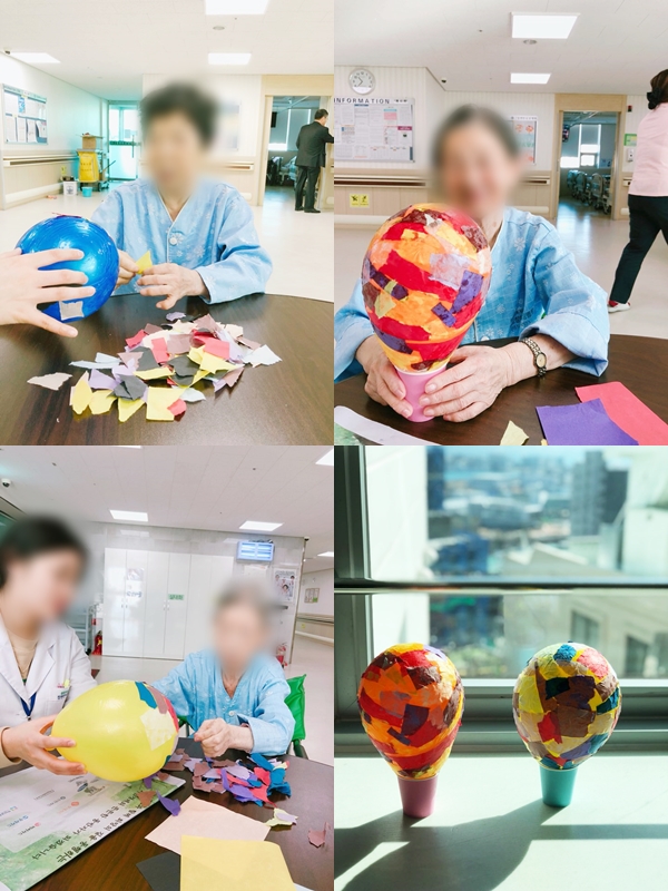 미술치료 - 열기구 만들기 본문 2018년 1월 26일 (금) 오늘은 미술치료로 열기구 만들기를 하였습니다. 참여자들은 자신이 원하는 색의 한지를 찢어 풍선에 붙이며 즐거워 하셨고, 완성된 열기구를 보고 만족하시는 듯 환한 미소를 보이셨습니다~! 이전글 목록 다음글
