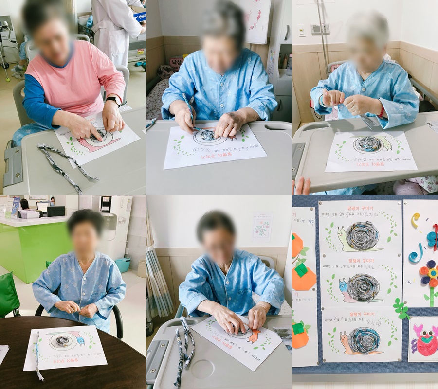 미술치료 - 달팽이 꾸미기 본문 2018년 2월 2일 (금) 오늘은 미술치료로 달팽이 꾸미기를 하였습니다. 귀여운 달팽이 도안을 보시고도 징그럽고 무섭다고 하셨지만, 곱게 색칠한 뒤 신문지로 꾸며 완성하자 예쁘다며 만족스러워 하셨습니다^^ 이전글 목록 다음글