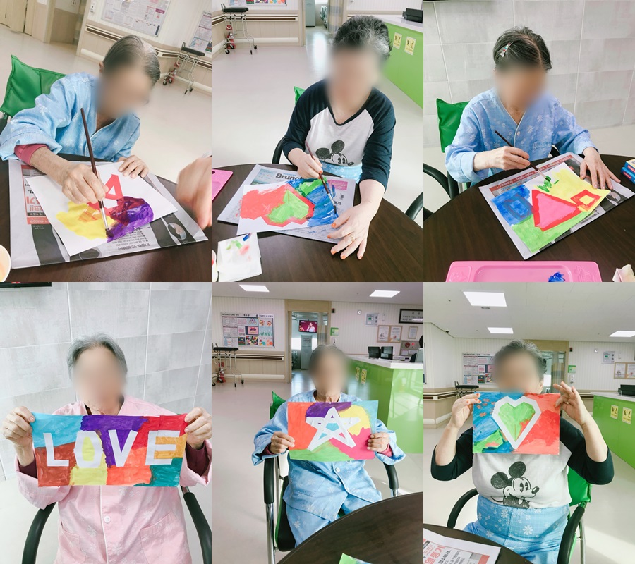 미술치료 - 물감 찍기 본문 2018년 1월 5일 (금) 오늘은 미술치료로 물감 찍기를 하였습니다. 전기테이프로 그림 또는 글자를 만들고, 자신이 원하는 색깔로 꾸민 후 전기테이프로 떼어내자 멋진 작품이 완성되었습니다. 자신이 만든 작품이 예쁘다 좋아하기도 하시면서 신기해하는 표정을 짓기도 하셨습니다^^ 이전글 목록 다음글