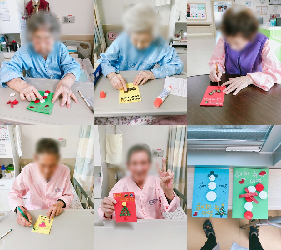 미술치료 - 카드 만들기 본문 2017년 12월 21일 (목) 오늘은 미술치료로 카드 만들기를 하였습니다. 편지 내용으로 한참 고민을 하기도 하셨지만 사랑하는 사람들에게 정성스럽게 글을 쓰셨으며, 카드를 완성한 후 소중하게 간직하는 모습을 보이셨습니다~! 이전글 목록 다음글
