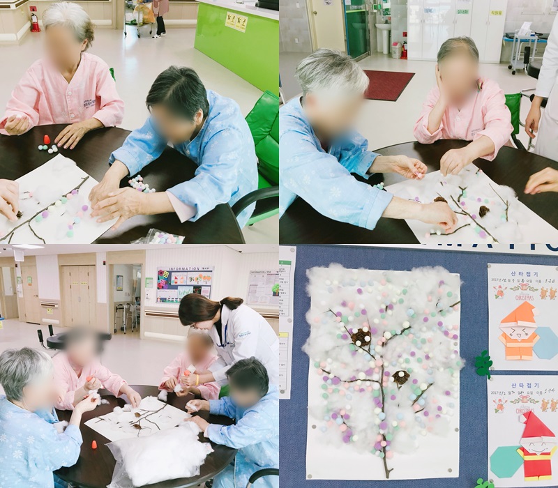 미술치료 - 겨울 나무 만들기 본문 2017년 12월 22일 (금) 오늘은 미술치료로 겨울 나무 만들기를 하였습니다. 눈이 소복소복 내린 것을 표현하기 위한 솜과 알록 달록 열매를 표현하기 위한 폼폼이로 예쁜 겨울 나무를 꾸몄습니다. 완성한 작품을 보시고는 "겨울 나무가 참 예쁘다"라며 참여자분들이 박수를 치며 좋아하셨습니다^^ 이전글 목록 다음글