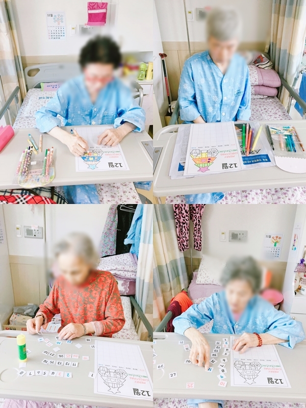인지치료 - 12월 달력 만들기 본문 2017년 11월 30일 (목) 오늘은 인지치료로 12월 달력 만들기를 하였습니다. "해가 바뀌어 추운 겨울이 되었다" 라고 말씀하시며 날짜를 하나씩 붙이기도 하셨고, 서로 색칠한 것을 자랑 하시며 환한 미소를 보이셨습니다~! 이전글 목록 다음글