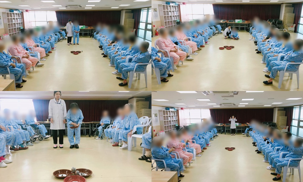 2017년 9월 8일 (금) 오늘은 치료레크리에이션으로 신문지 공 던지기를 하였습니다.