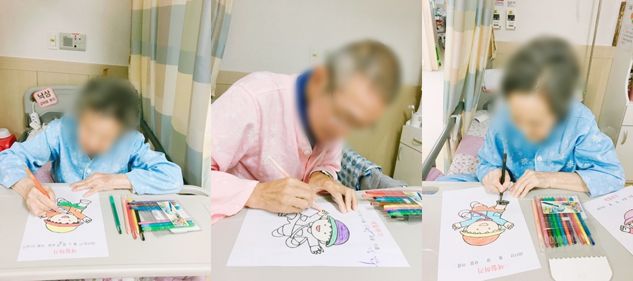 미술치료 - 색칠하기 본문 2017년 10월 8일 (금) 오늘은 미술치료로 색칠하기를 하였습니다. 꼬마 남자 아이를 보고 손자 생각이 나시는 듯 평소보다 꼼꼼하게 색칠을 하셨습니다. 완성 후, 침대 옆에 있는 서랍에 붙이고 기분 좋은 웃음을 보이기도 하셨습니다! 이전글 목록 다음글