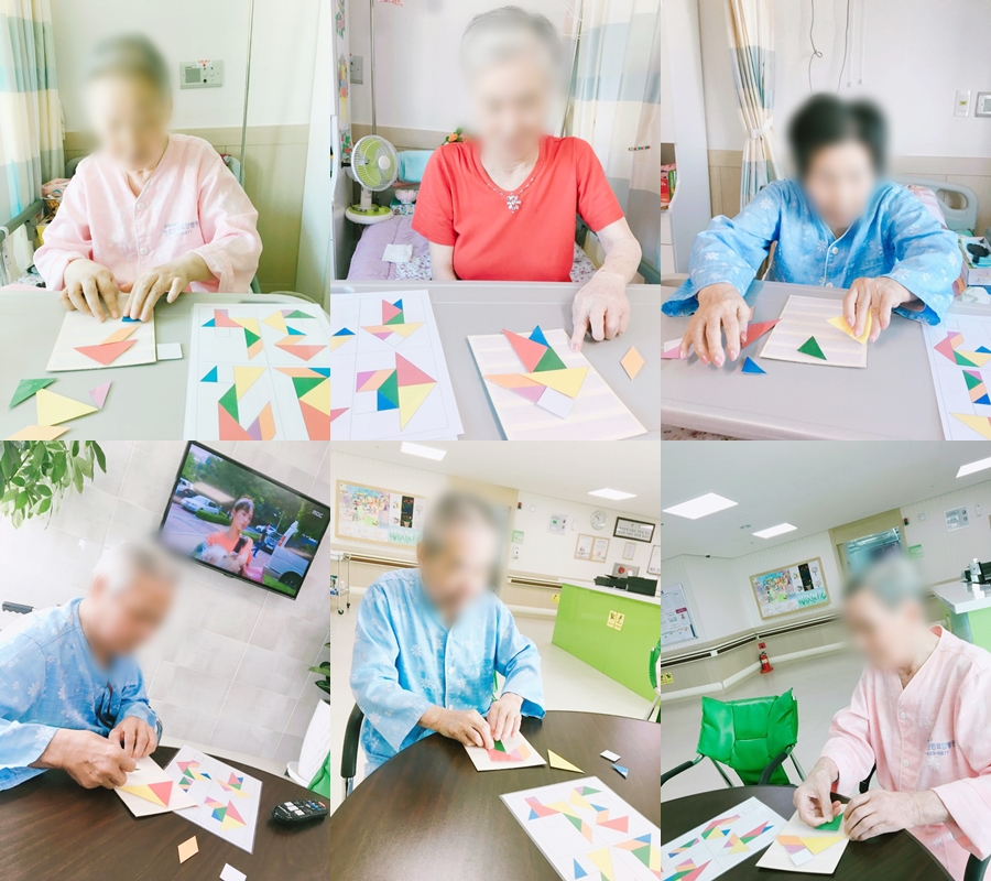 인지치료 - 칠교 본문 2017년 10월 10일 (화) 오늘은 인지치료로 칠교를 하였습니다. 모양이 다양해서 다소 혼란을 겪는 모습을 보이기도 하셨으나 차근차근 맞춰가셨으며 완성 후, 함박 웃음을 보이셨습니다! 이전글 목록 다음글