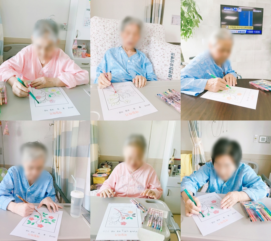 미술치료 - 색칠하기 본문 2017년 10월 19일 (목) 오늘은 미술치료로 색칠하기를 하였습니다. 도안을 보고 "예쁜 꽃이네~" 라고 말씀하시며 꽃의 종류를 물어보시기 하셨고 다양한 색을 통해 화려한 작품이 탄생하자 환한 미소를 보이기도 하셨습니다! 이전글 목록 다음글