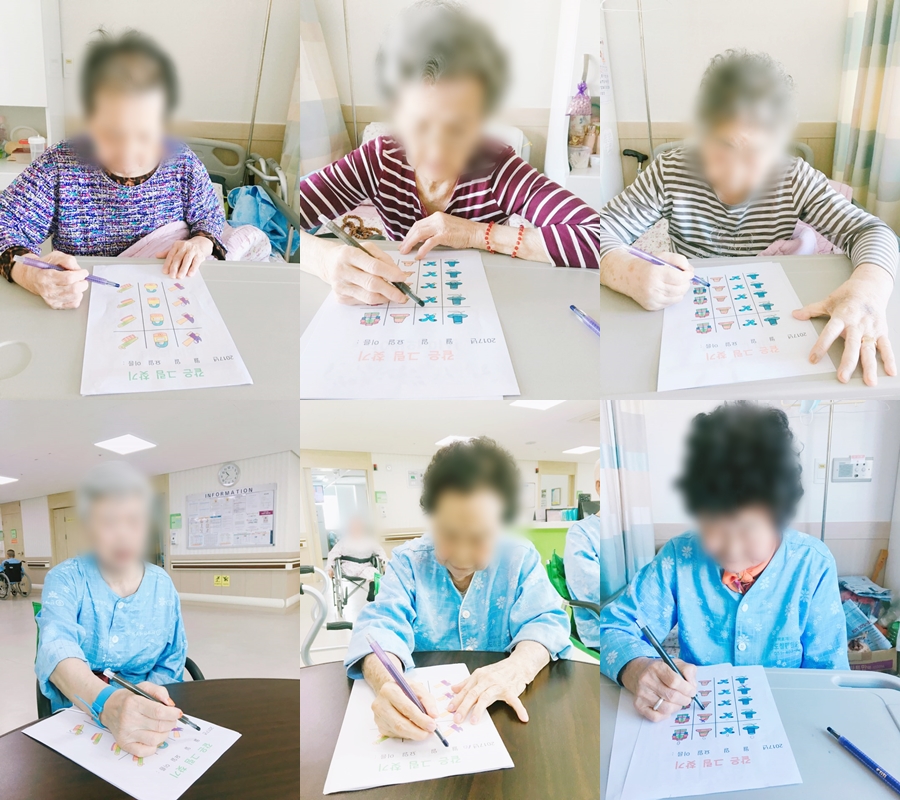 인지치료 - 같은 그림 찾기 본문 2017년 10월 20일 (금) 오늘은 인지치료로 같은 그림 찾기를 하였습니다. 비슷비슷한 그림을 보고 "내 눈에는 다 똑같아" 라고 투정을 부리기도 하셨지만, 도중에 포기를 하는 참가자 없이 마무리 되었습니다^^ 이전글 목록 다음글
