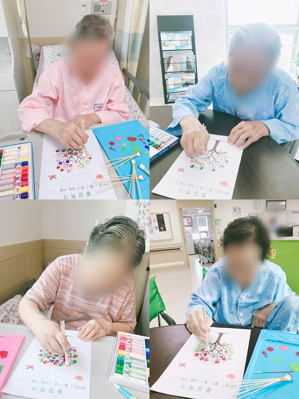 미술치료 - 물감 찍기 본문 2017년 8월 28일 (월) 오늘은 미술치료로 물감 찍기를 하였습니다. 자신이 원하는 색의 물감을 골라 나무를 완성하셨으며 빈 곳이 없는지 찾기도 하셨습니다. 완성된 나무를 바라보시며 "가을 나무네" 라고 말씀하셨고 즐거워 하셨습니다! 이전글 목록 다음글
