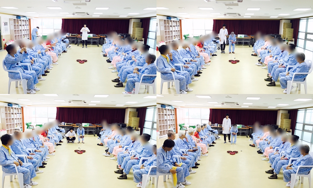 치료레크리에이션 - 신문지 공 던지기 본문 2017년 7월 17일 (월) 오늘은 치료레크리에이션으로 신문지 공 던지기를 하였습니다. 강당 문을 열고 들어오시며 "오늘은 어려운 게임을 한다" 라고 말씀하시며 투정아닌 투정을 부리셨습니다. 하지만 서로를 격려하며 훈훈한 분위기 속에서 즐겁게 마무리 하였습니다. 이전글 목록 다음글