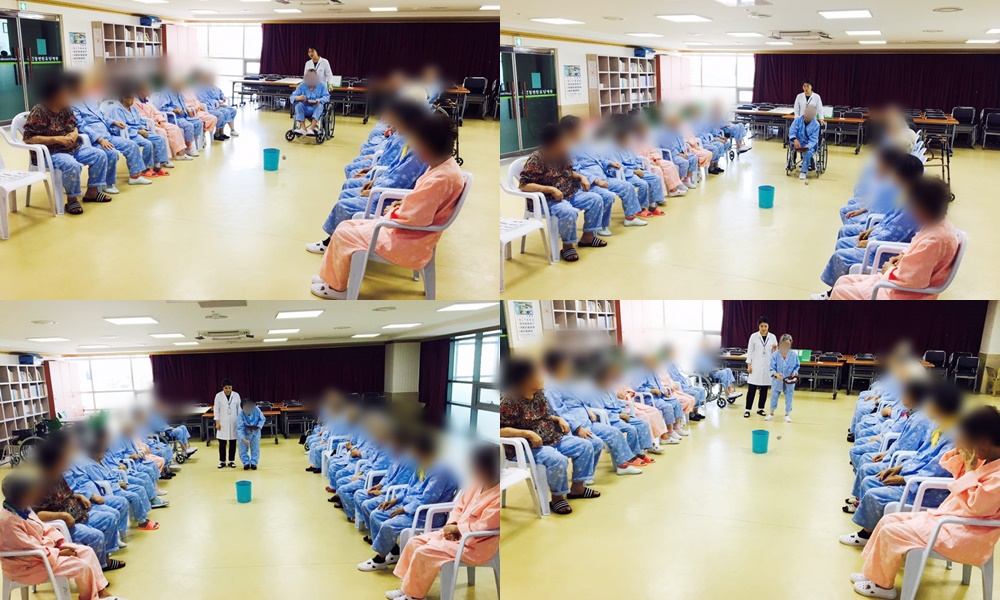 2017년 6월 13일 (화) 오늘은 치료레크리에이션으로 신문지 공 넣기를 하였습니다.