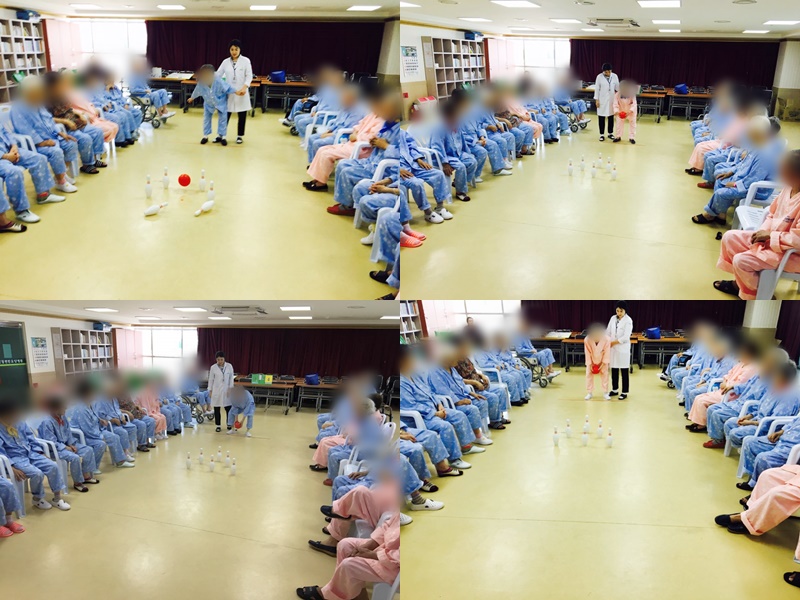 치료레크리에이션 - 볼링 본문 2017년 6월 14일 (수) 오늘은 치료레크리에이션으로 볼링을 하였습니다. 각 팀의 점수차이가 많이 벌어져서 지고 있는 청팀의 어르신들이 의욕을 잃으시는 모습도 보이셨습니다. 하지만, 마지막 판을 이기신 후 기뻐하셨고 즐겁게 마무리 할 수 있었습니다. 이전글 목록 다음글