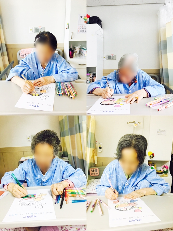 미술치료 - 색칠하기 본문 2017년 6월 19일 (월) 오늘은 미술치료로 색칠하기를 하였습니다. 낯선 캐릭터를 색칠 하시느라 어떤 색을 골라야 하는지 막막해 하셨지만, 이내 캐릭터에 적응을 하셨는지 다양한 색을 섞어가며 즐겁게 참여하시는 모습이 너무나 이쁘셨습니다! 이전글 목록 다음글