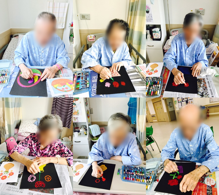 미술치료 - 사포 그림 그리기 본문 2017년 6월 9일 (금) 오늘은 미술치료로 사포 그림 그리기를 하였습니다. 4가지 그림 도안 중 자신이 원하는 그림 도안을 선택하여 똑같이 그리거나, 상상을 하여 그림을 그리며 다양한 색깔로 표현을 하셨고, 완성된 그림이 게시판에 게시되자 좋아하시며 한참을 바라보셨습니다^^ 이전글 목록 다음글