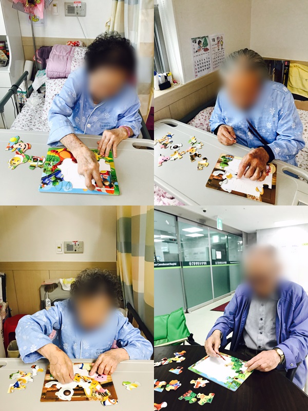 인지치료 - 퍼즐 맞추기 본문 2017년 5월 12일 (금) 오늘은 인지치료로 퍼즐 맞추기를 하였습니다. 큰 조각들을 퍼즐이였지만 퍼즐 판에 하나씩 맞추는 것을 어려워하시면서도 그림이 완성 되어가는 것을 보시고는 신기하다며 좋아하셨습니다^^ 이전글 목록 다음글